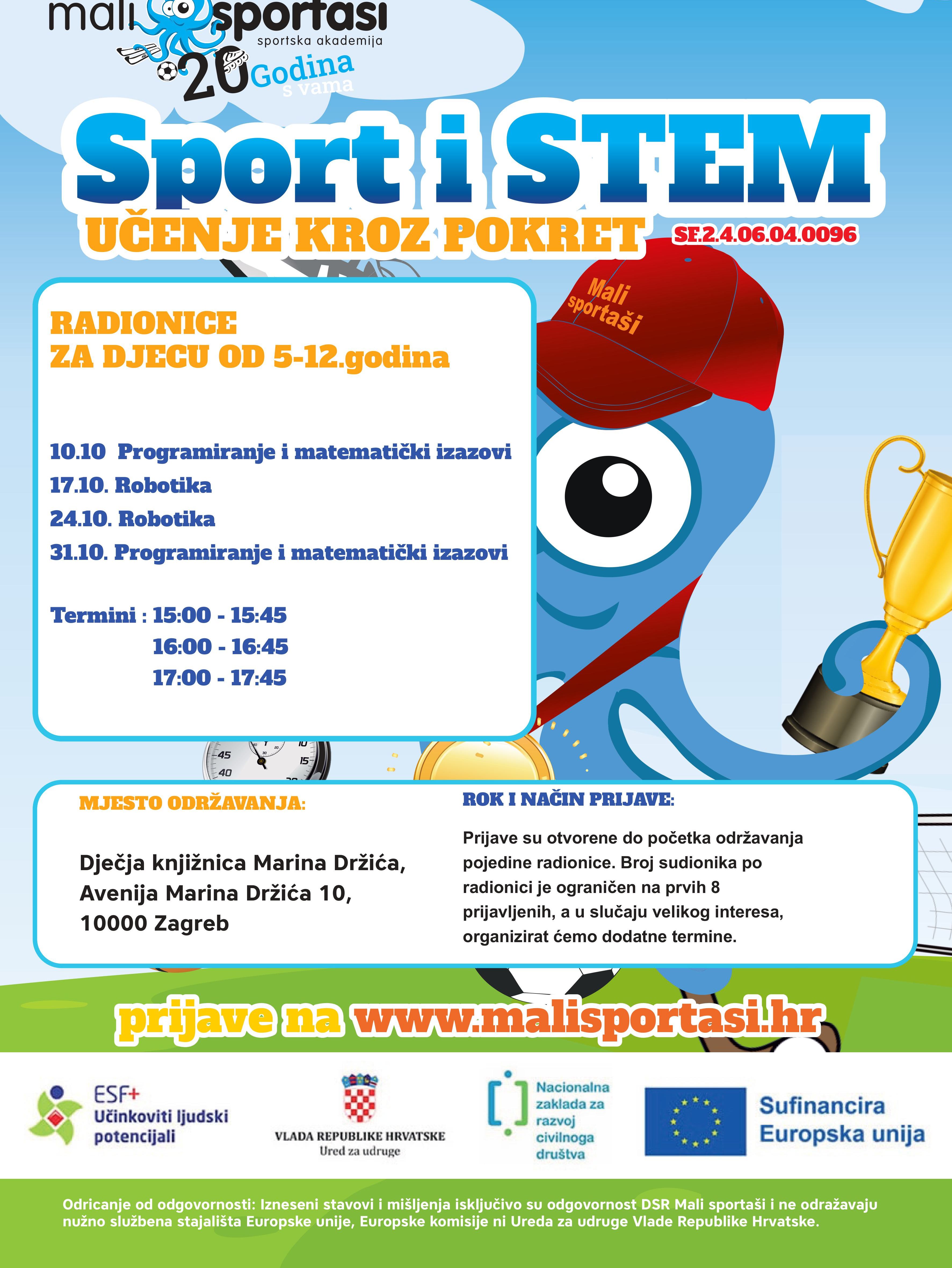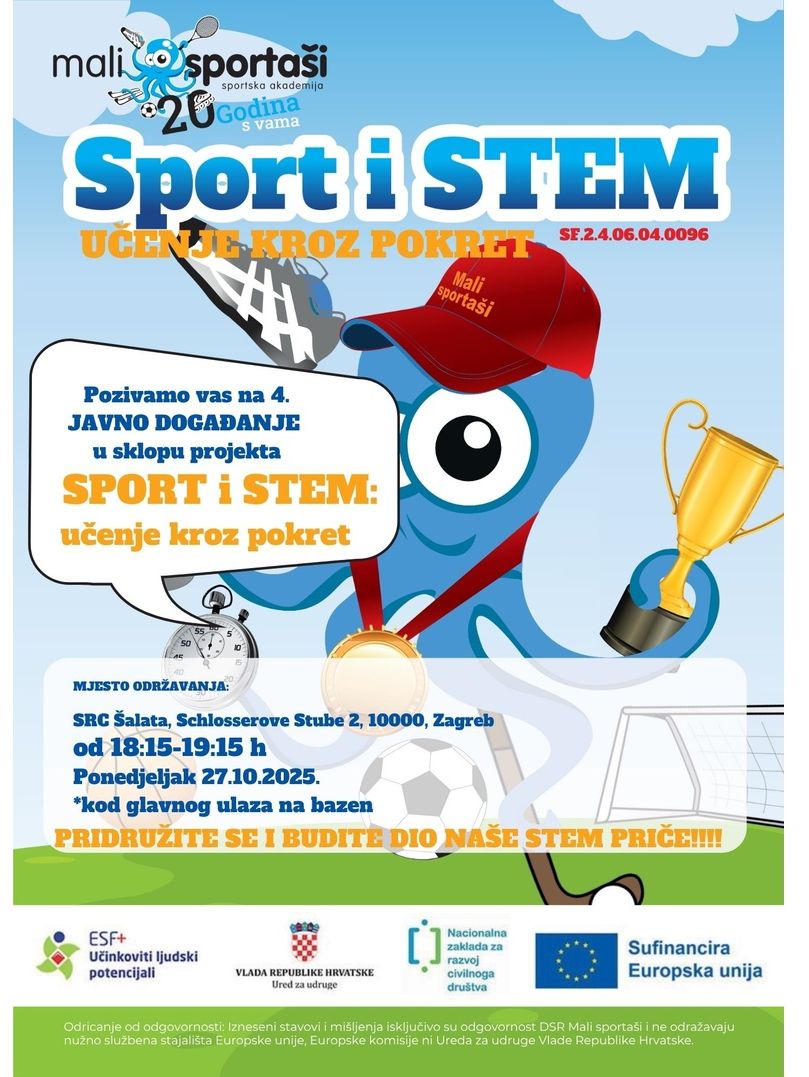 Pozivamo vas na 4. javno događanje u sklopu projekta SPORT i STEM: učenje kroz pokret!Djeca će imati priliku upoznati se s osnovama našeg programa koji spaja sport i STEM kroz igru i kretanje. Mjesto održavanja:SRC Šalata, Schlosserove